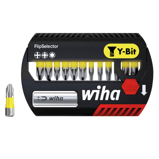 The Wiha FlipSelector Y-Bit Set 13 Piece comes with a selection of high quality Y-bits. Ideal for fastening Y-shaped screws with an angle not equal to 90 between the thread and screw head. Thanks to its patented torsion zone, the bit is also suitable for power tools and impact screwdrivers and guarantees a 120x greater lifespan compared to Wiha standard bits. The coloured bits are also quick and easy to find, even in the dark by using an UV light, thanks to its fluorescent coating. This reduces the number of bits which are lost and saves on the expense of acquiring new ones. Bits conform to DIN 3126, ISO 1173, Style C6,3. The FlipSelector case has a tried and tested design. Made from impact resistant, glass-fibre reinforced polyamide. Always ready to use, easily fits into trouser pockets. The case also features a handy belt clip. This 13 Piece Set contains the following: 2 x 25mm Phillips Y-Bits: PH2 . 4 x 25mm Pozidriv Y-Bits: PZ1, PZ2 & PZ3. 6 x 25mm TORX Y-Bits: T10, T15, T20, T25, T30 & T40. 1 x Magnetic Bit Holder 60mm.