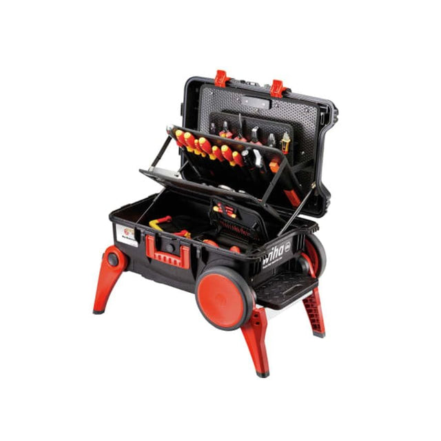This 106 Piece Wiha XXL III electric Tool Case Set is supplied in a XXL III electric tool case. Made of robust polypropylene, fitted with gas-filled shock absorbers which hold the lid in different positions, preventing it from closing accidentally and smashing fingers. It is fitted with extra large wheels so its easy to pull the case along. The legs can be folded out, turning the case into a slip-proof step. In addition, the raised position allows the comfortable and strain-free removal of the tools. The V-shaped incision with a scale in the lid of the case facilitates the sawing of materials, such as cable ducts, at the construction site. Contains the following: 1 x slimVario electric Tool Set, 32 Piece (inc. multifunctional bag). 1 x Pair of Classic Wrench Pilers 250mm. 1 x Automatic Stripping Tool up to 16mm. 1 x Automatic Crimp Tool for wire-end sleeves hex crimping 0.08-16. 1 x Crimping Tool for insulated cable eyes and contacts 0.5-6. 1 x Professional electric Cable Cutter with switchable opening spring 180mm. 1 x Professional electric Needle Nose Pliers 200mm. 1 x Professional electric Diagonal Cutters with DynamicJoint 160mm. 1 x TriCut Professional electric Installation Pliers 170mm. 1 x BiCut Professional High-performance Diagonal Cutters with DynamicJoint 200mm. 1 x electric Hacksaw with 3 x Saw Blades 150mm. 1 x XLSelector Y Bit Set, 32 Piece. 1 x Single-pole, Non-contact Volt Detector, 121,000V AC Inc. 2 x AAA Batteries. 1 x Universal Key. 1 x Magicring Hex L-key Set, 10 Piece in ErgoStar holder (1.5-10mm). 1 x Flashlight (LED, laser and UV) Inc. 3 x AAA Batteries. 1 x Stripping Tool for round cables. 1 x Longlife Electrician's folding Ruler 2m. 1 x Electrician's Hammer 300g. 1 x Dowel racket set SoftFinish with 6 mm round blade and 4 dowels (41289). 1 x SoftFinish One-piece Hexagonal Blade Screwdriver with a solid steel cap 12.0 x 200mm. 3 x SoftFinish electric slimFix Slotted Screwdrivers: 3.5 x 100mm, 5.5 x 125mm & 6.5 x 150mm. 2 x SoftFinish electric slimFix Phillips Screwdrivers: PH1 x 80mm & PH2 x 100mm. 2 x SoftFinish electric slimFix PlusMinus/Pozidriv Screwdrivers: SL/PZ1 x 80mm & SL/PZ2 x 100mm. 1 x Electrician's Spirit Level 40cm. 1 x SoftFinish Bottle Opener.