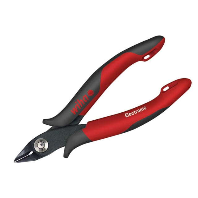 The Wiha Electronic Diagonal Cutters are ideal for producing an absolutely flush cut of soft wires, perfect for use in the electronics industry. Made from C 70 special tool steel with a wide, pointed head. It also features cutting edges without a bevelled edge. Ergonomically shaped plier handles ensures comfortable, fatigue-proof work. Specifications: Overall Length: 130mm. Cutting Capacity (mm) : Soft: 1.3mm.