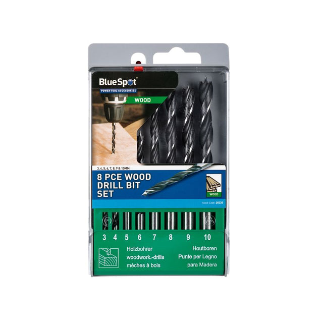 The BlueSpot 8 Piece Wood Drill Bit Set is specially designed for fast and accurate drilling in timber and man-made boards. Precision ground lip and spur type wood drills. Includes handy carrying case for quick and convenient storage.