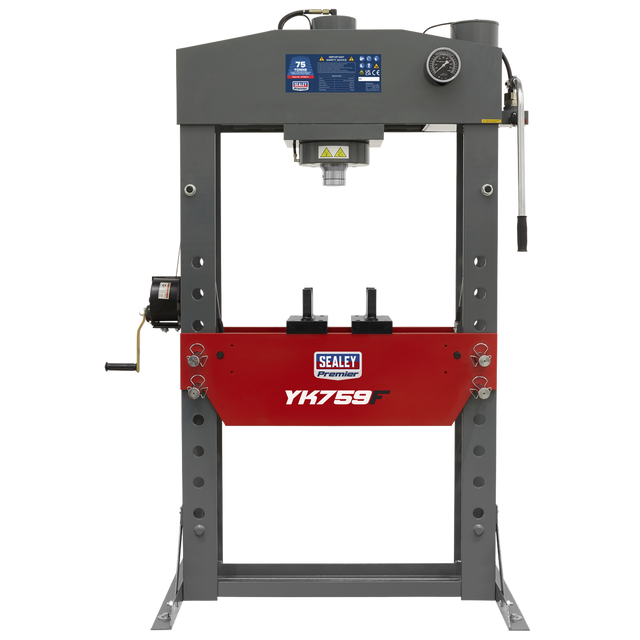 Steel frame construction with 2-speed hydraulic pump unit. Sliding hydraulic ram assembly giving 260mm of lateral travel for off-centre pressing applications. Fitted with ram pressure gauge and supplied with flat pressing plate/V-blocks.