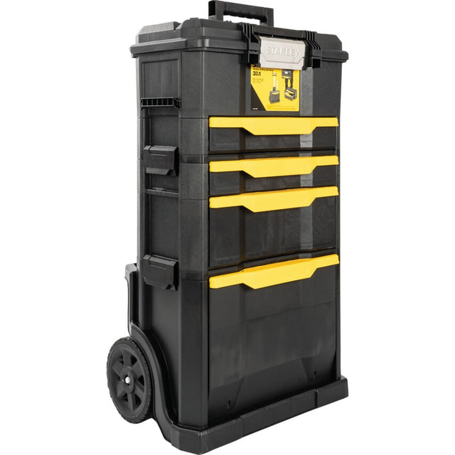 Portable detachable containers with handle on top allowing customised storage options and to carry only the options you need. Top detachable 19" toolbox with drawer and one-handed operation latch, 2 drawer storage unit with shallow and deep drawer and bottom flip bin with back pocket for long tools storage (saw and level) - versatile organisation for various sizes of tools and small parts. Aluminium telescopic back handle for easy elevation. Heavy duty ball bearing slides for the drawers and heavy duty 7" wheels for easy on-site manoeuvrability.