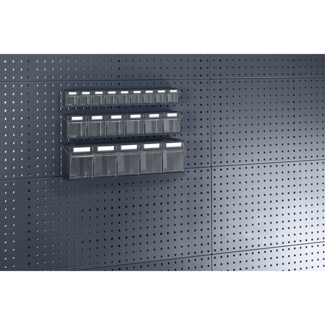 A dense storage solution for small components. Clear tough K-resin transparent tilt boxes provide a highly visible storage system. Labels included.