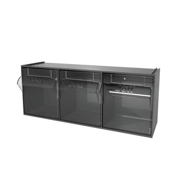 A dense storage solution for small components. Clear tough K-resin transparent tilt boxes provide a highly visible storage system. Labels included.