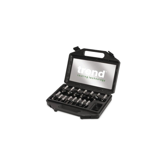 Contents | 1 x 'V' Groove 45\u00b0 | 1 x Core Box radius 6.35mm | 1 x Dovetail \u00d8 12.7mm | 1 x Guided Chamfer 45\u00b0 | 1 x Guided Rebater 11.1 rebate | 1 x Guided Roman Ogee radius 4mm | 1 x Guided Trimmer \u00d8 12.7mm | 1 x Single Flute \u00d8 4.8mm x 11mm | 1 x Two Flute \u00d8 6.3mm x 19mm | 1 x Two Flute \u00d8 12.7mm x 25mm cut | 1 x Two Flute \u00d8 19mm x 25mm cut | 2 x Guided Cove radius 6.3mm & 12.7mm | 2 x Guided Round Over radius 9.5mm & 12.7mm |