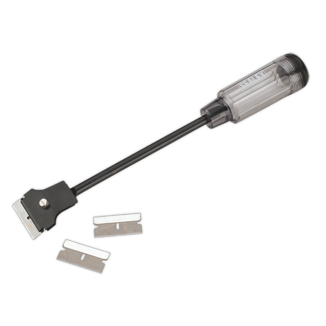 Long handled razor scraper. Suitable for scraping gaskets and also for removing labels, stickers and overspray from car windows. Safe storage of spare blades in handle. Supplied with three razor and three plastic blades.