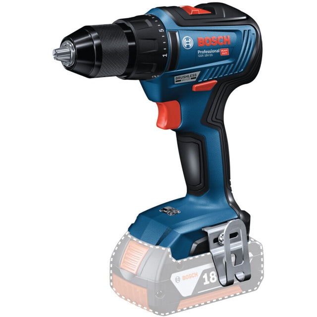 The Bosch GSR 18V-55 Professional cordless drill driver with brushless motor is an entry-level tool in the Bosch 18V lineup, combining robust power and versatility. This cordless drill driver excels in wood and metal work, ensuring maximum efficiency on diverse job sites.