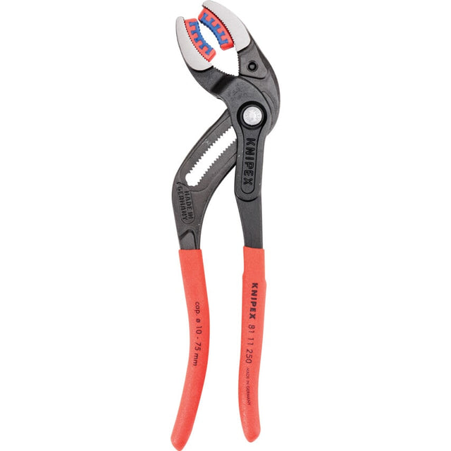 Robust pliers with 25 adjustment positions. Made from Chrome vanadium electric steel with an oil-hardened coating. Ideal for tightening and loosening of siphon screw connections, plastic pipe connections and round cap nuts as well as gentle loosening of hoses on nozzles.