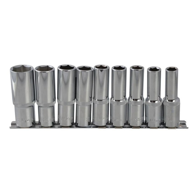 This Blue Spot socket set contains 9 useful 1/2 inch square drive sockets which are made from chrome vanadium steel for strength and durability and which have a deep reach for better access. The set contains the following sizes 10, 11, 12, 13, 14, 15, 17, 19 and 22mm. Supplied with a storage rack.