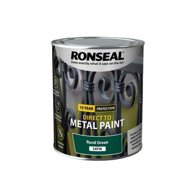 Ronseal Direct To Metal Paint 750ml Rural Green Satin Ronseal Direct to Metal Paint is a high quality water based paint that provides a tough and durable finish to your metal, and can be applied directly to rust. Due to geographical locations we are unable to deliver to: Isle of Wight, Isle of Man and Ireland.