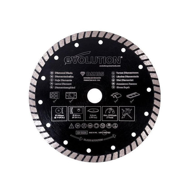 The Evolution Segmented Rim Diamond Blade greatly enhances the Evolution multi-purpose saws versatility. It allows the machine to cut stone, concrete, paving slabs and marble. A durable blade which features a high concentration of diamond for longevity and a hot-pressed turbo segmented rim for consistent cutting ability.
