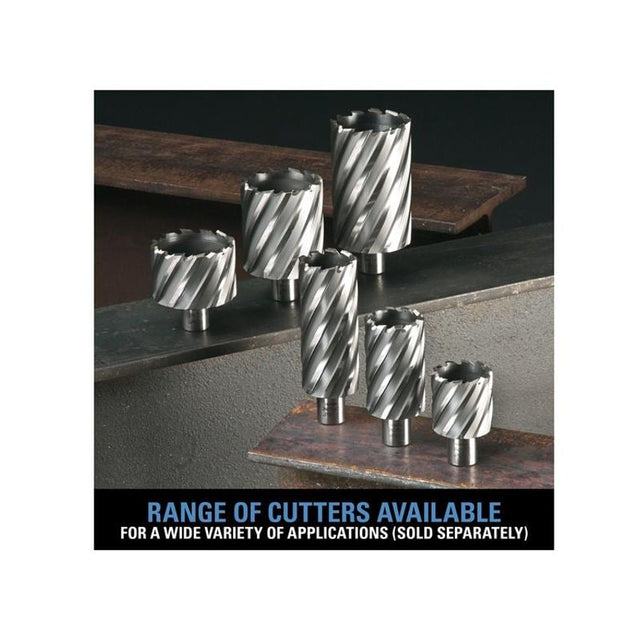 The Evolution EVOMAG42 Magnetic Drill is versatile, accurate and fast, with strong magnetic adhesion (1500kg), the EVOMAG42 is an essential tool when performing heavy-duty industrial and steel fabrication work. The cuts are precise and clean due to an optimised rotation speed (450rpm) and all popular broaching capacities are covered (12-42mm). and the innovative adjustable head system means twist drills can be used to full capacity. Specification: Input Power: 1,200W.No Load Speed: 450/min.Magnet Adhesion: 1500kg.Maximum Cutter Diameter: 42mm, Depth: 50mm.Dimensions Rack Fully Raised (HxWxL): 580 x 320x 180mm, Lowered: 340 x 320 x 180mm.Magnet Dimensions (HxWxL): 40 x 90 x 180mm.Cutter Retainer Internal Diameter: 19mm Weldon Shank.Recommended Maximum Duty Cycle: 30 minutes.Sound Pressure Level LPA: 89.4 dB(A).Weight: 10.9kg.