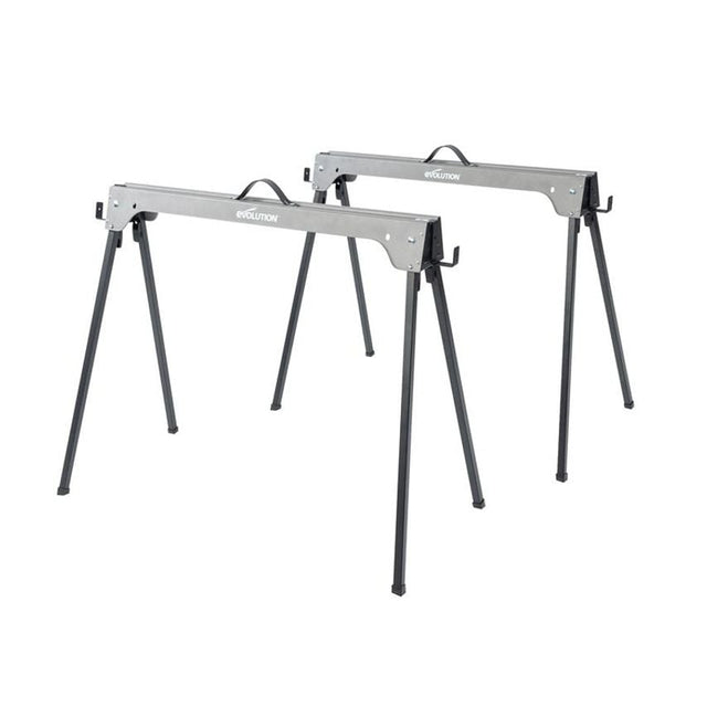 The Evolution Metal Folding Sawhorse Stand is ideal for setting up a sturdy and reliable worktop. Each sawhorse boasts an incredible supporting weight of up to 500kg, giving you peace of mind when cutting. Whether it's logs or large sheet materials, simply space the horses accordingly to provide a flat platform every time. Go from cut to carry instantly with the foldable frame and integrated carry handles. This handy saw accessory is ideal for any DIY project. A perfect addition to your workshop arsenal. Supplied as a twin pack.