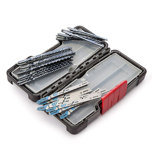 30 piece jigsaw blade set containing blades for wood and metal, sold in a tough box for safekeeping 30 Piece Jigsaw Blade Set Basic for Wood and Metal. This well-made box has 4 compartments for the storage of jigsaw blades. Made from tough plastic with anti-slip cushioned corners. Set contains: 10 x T119BO Basic for Wood 10 x T111C Basic for Wood 10 x T118A Basic for Metal Specification: Shank: Single lug shank Weight: 0.3kg