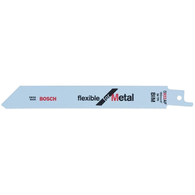 Bosch S922AF (2608656013) Sabre Saw Blade 150mm For Metal (5 Pack) Features: BIM, wavy set, milled For thin sheet metals (0.7-3 mm), fine pipes/profiles (diameter <100 mm) Effortless, fine cut Long life Pack of 5 Specification: Material: BIM Tooth design: wavy set, milled Tooth spacing [mm] / TPI: 1 / 24 Dimensions LxWxT(mm): 150 x 19 x 0.9 Areas of application: thin sheet metals (0.7-3 mm), fine pipes/profiles (diameter <100 mm), effortless, fine cut Qty: Pack of 5