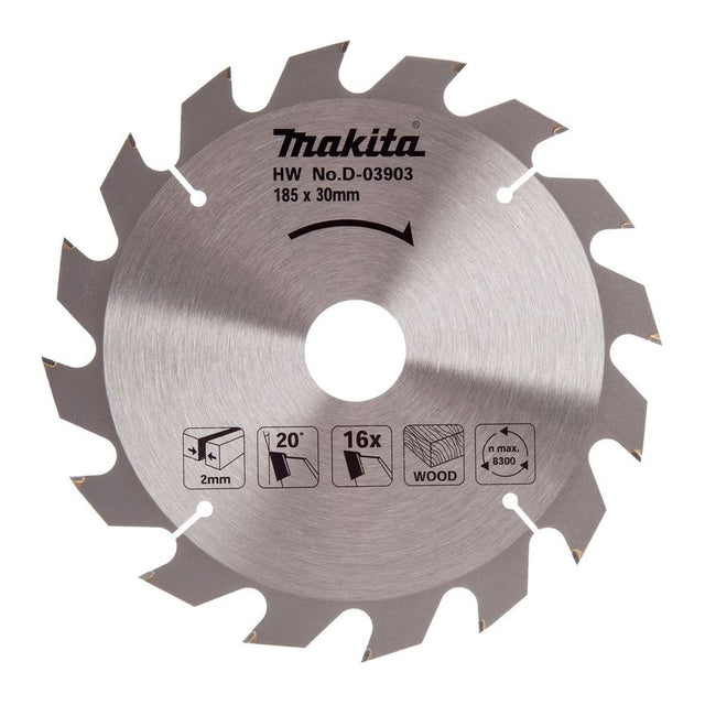 Makita D-03903 Circular Saw Blade for Wood 185 x 30 x 16 Teeth The Makita D-03903 is a Standard Blade for a Portable Saw. It has a Diameter of 185mm with a tooth count of 16, suited to faster cutting with a rough finish. Features: Application: Wood, carpentry, joinery Good cutting speed at low cost Specification: Bore: 30mm Diameter (D): 185 mm Kerf (K): 1.8 mm Rake (R): 20 ? Thickness (T): 1.2 mm Tooth Count: 16 Material Type: Wood Weight: 0.6kg