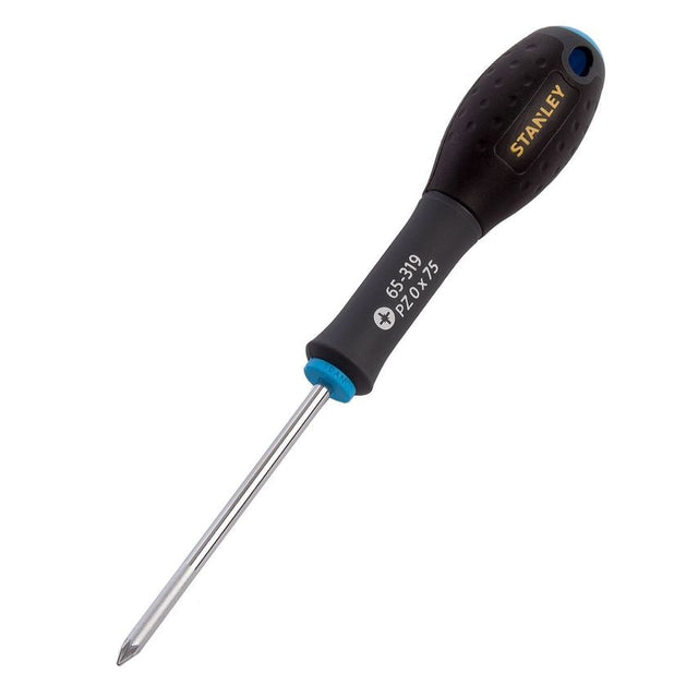 Stanley 0-65-319 FatMax Screwdriver Pozi Pz0 x 75mm The Stanley FatMax 0-65-319 Screwdriver has a chrome vanadium steel bar shaft which allows high torque and reduces the risk of tip breakage. The handle is moulded directly to the shaft for a virtually unbreakable bond giving long life and durability. The soft-grip handle gives a perfect combination of great grip and reduced fatigue in use and is colour coded for easy identification of the right tip type for the application. The smooth domed end offers fast, comfortable spinning action and the large diameter handle offers higher torque when driving wood screws. Features: Chrome vanadium steel bar allows for high torque and reduces the chance of tip breakage Colour coded ends make it easy to identify the correct screwdriver for each screw type Handle moulded directly to the bar for a virtually unbreakable bond. Highly reliable and providing an extra-long life Hanging hole for easy storage Large diameter handle offers great torque needed for driving wood screws Shot blasted tips ensure improved torque and corrosion protection Smooth domed end for fast spinning action speed and comfort Soft grip handle the perfect combination of great grip and reduced fatigue Specification: Type: Pozidriv Tip Size: PZ.0 Blade Length: 75mm (3 in) Net Weight: 0.049kg