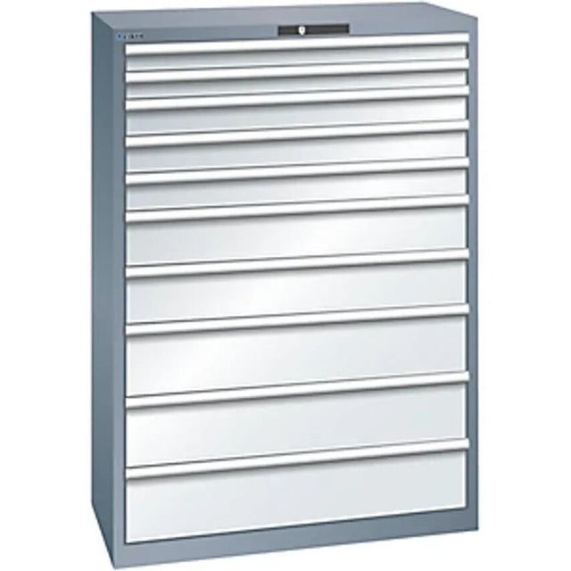 Drawer cupboard, 10 drawers, WxDxH 1023 x 725 x 1450 mm, grey metallic/light grey. Supplied = assembled. Height = 1450 mm. Width = 1023 mm. Depth = 725 mm. Number of drawers = 10 pcs. Drawer height = 1x50, 5x100, 4x200 mm. Drawer extension = 100%. Body colour = metallic grey NCS S6502-B. Front colour = light grey RAL 7035. Fittings = individual pull-out stop. Material = welded sheet steel. Drawer guide = differential guide rails without cross beams. Lock type = KEY lock (individual keys) with central locking and replaceable cylinder, incl. 2 keys with key number. Internal drawer dimensions = 918x612 mm. Feature = can be labelled. Overall max. load = 4000 kg. Drawer cupboard paintwork: Impact resistant and hardwearing surface due to environmentally friendly powder coating. Paintwork inside drawers: Full surface corrosion protection due to electro-deposition immersion painting, dove grey, NCS S 4502-B. Material: Very hardwearing due to precise and sturdy construction using high quality, welded sheet steel, max. load up to 4 tonnes. Tight closing drawer construction provides protection from dust and liquids. Individual drawer lock with lift-out protection, perfect usability due to 100% utilisation of space and free choice of partition material. Clearance height: 1350 mm. Drawer WxD 918 x 612 mm. Arrangement of front heights/effective heights: (max. load per drawer) : 50/32.5 mm (75 kg) , 100/82.5 mm (75 kg) , 200/182.5 mm (200 kg)