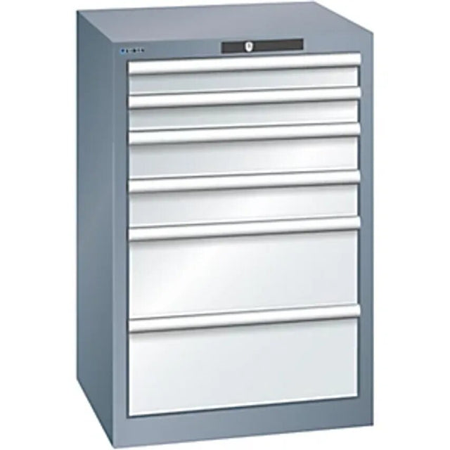 Drawer cupboard, 6 drawers, WxDxH 564 x 572 x 850 mm, grey metallic/light grey. Supplied = assembled. Height = 850 mm. Width = 564 mm. Depth = 572 mm. Max. drawer load = 75 kg. Number of drawers = 6 pcs. Drawer height = 2x75, 2x100, 2x200 mm. Drawer extension = 100%. Body colour = metallic grey NCS S6502-B. Front colour = light grey RAL 7035. Fittings = individual pull-out stop. Material = welded sheet steel. Drawer guide = differential guide rails without cross beams. Lock type = KEY lock (individual keys) with central locking and replaceable cylinder, incl. 2 keys with key number. Internal drawer dimensions = 459x459 mm. Feature = can be labelled. Overall max. load = 4000 kg. Drawer cupboard paintwork: Impact resistant and hardwearing surface due to environmentally friendly powder coating. Paintwork inside drawers: Full surface corrosion protection due to electro-deposition immersion painting, dove grey, NCS S 4502-B. Material: Very hardwearing due to precise and sturdy construction using high quality, welded sheet steel, max. load up to 4 tonnes. Tight closing drawer construction provides protection from dust and liquids. Individual drawer lock with lift-out protection, perfect usability due to 100% utilisation of space and free choice of partition material. Clearance height: 750 mm. Drawer WxD 459 x 459 mm, arrangement of front heights/effective heights: 75/57.5, 75/57.5, 100/82.5, 100/82.5, 200/182.5, 200/182.5 mm.