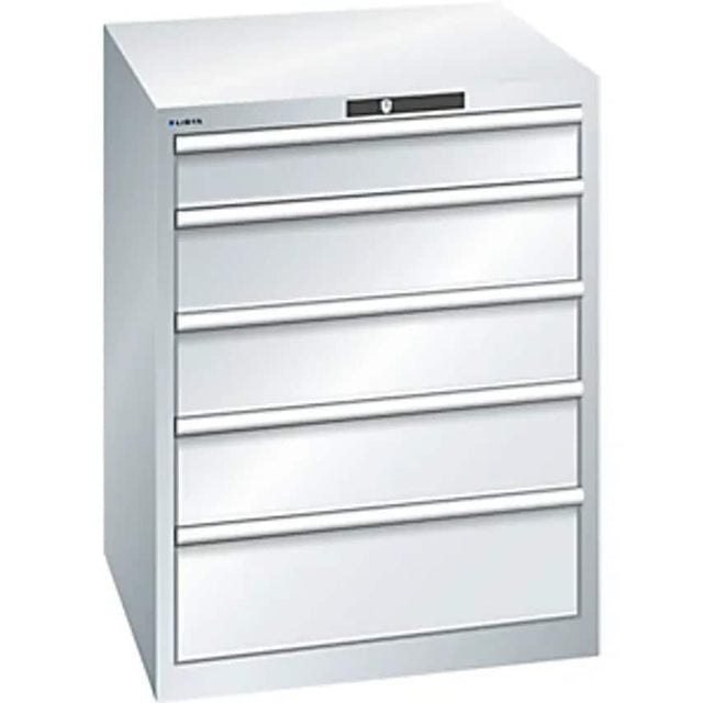 Drawer cupboard, 5 drawers, WxDxH 717 x 725 x 850 mm, light grey, max. drawer load 75 kg. Supplied = assembled. Height = 850 mm. Width = 717 mm. Depth = 725 mm. Max. drawer load = 75 kg. Number of drawers = 5 pcs. Drawer height = 1x100, 3x150, 1x200 mm. Drawer extension = 100%. Body colour = light grey RAL 7035. Front colour = light grey RAL 7035. Fittings = individual pull-out stop. Material = welded sheet steel. Drawer guide = differential guide rails without cross beams. Lock type = KEY lock (individual keys) with central locking and replaceable cylinder, incl. 2 keys with key number. Internal drawer dimensions = 612x612 mm. Feature = can be labelled. Overall max. load = 4000 kg. Drawer cupboard paintwork: Impact resistant and hardwearing surface due to environmentally friendly powder coating. Paintwork inside drawers: Full surface corrosion protection due to electro-deposition immersion painting, dove grey, NCS S 4502-B. Material: Very hardwearing due to precise and sturdy construction using high quality, welded sheet steel, max. load up to 4 tonnes. Tight closing drawer construction provides protection from dust and liquids. Individual drawer lock with lift-out protection, perfect usability due to 100% utilisation of space and free choice of partition material. Clearance height: 750 mm. Drawer WxD 612 x 612 mm, arrangement of front heights/effective heights: 100/82.5, 150/132.5, 150/132.5, 150/132.5, 200/182.5 mm.