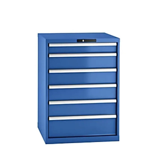 Drawer cupboard, sheet steel, HxW 1000 x 717 mm, 6 drawers, gentian blue. Supplied = assembled. Height = 1000 mm. Width = 717 mm. Depth = 725 mm. Max. drawer load = 75 kg. Number of drawers = 6 pcs. Drawer height = 1x100, 4x150, 1x200 mm. Drawer extension = 100%. Body colour = gentian blue RAL 5010. Front colour = gentian blue RAL 5010. Fittings = individual pull-out stop. Material = sheet steel, powder coated. Drawer guide = differential guide rails without cross beams. Lock type = cylinder lock with two keys. Internal drawer dimensions = 612x612 mm. Feature = can be labelled. WxD 717 x 725 mm (36 x 36 E) Smooth running drawers with differential guide rails without cross beams (100% extension) for medium to heavy duty requirements. Individual pull-out stops to protect against tipping. Aluminium grip rail with labelling option. Robust, powder coated sheet steel construction. Smooth running drawers with differential guide rails without cross beams (100 % extension) Central locking with cylinder lock. Also available on request with battery powered combination lock. Also available with battery powered combination lock on request. Your advantage Sophisticated, durable technology for the highest standards. Many functional details.