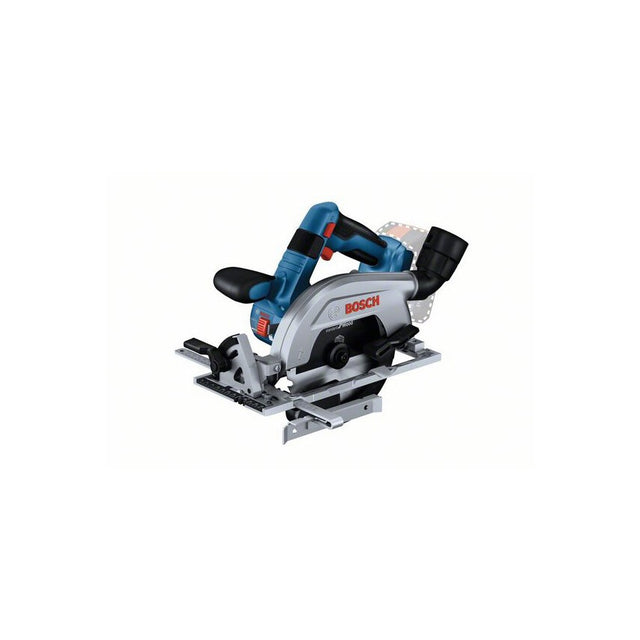 The compact sized GKS 18V 57-2 L Professional cordless circular saw - with its saw blade on the left - delivers impressive performance thanks to its powerful brushless motor. The 165mm saw blade allows a cutting depth of 57mm in 90 cuts and is optimized for cordless working which ensures both, a fast cutting progress and maximized battery runtime. It features a 360 rotatable dust port connector, which is compatible with the Click & Clean System. This supports high dust-extraction efficiency and ensures an increased user health protection.