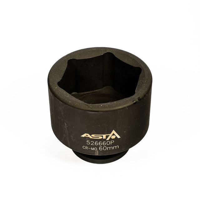 Professional individual 60mm impact socket for use with 3/4" drive impact wrench, ratchet or extension bar. Overall length of 75mm. Made of hardened and tempered Chrome Molybdenum (Cr-Mo) steel with manganese phosphate finish for extra corrosion resistance. Each feature retaining hole for extra safety (pin and safety ring can be purchased separately) Manufactured for professional daily use with air or battery powered impact wrench. Supplied as individual impact socket.