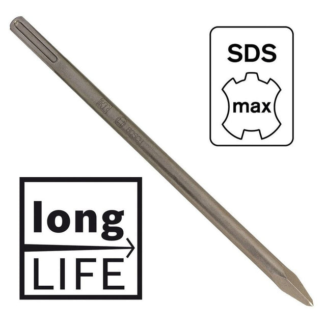 Chisels suited to heavy rotary and demolition hammers with SDS-Max shanks from Bosch. For demolition and correction work in concrete, and breakthroughs in masonry. Chisel for universal work in concrete and masonry. The entire impact energy is concentrated on one point and allows for the highest possible material removal rate due to the subsequent wedge effect.