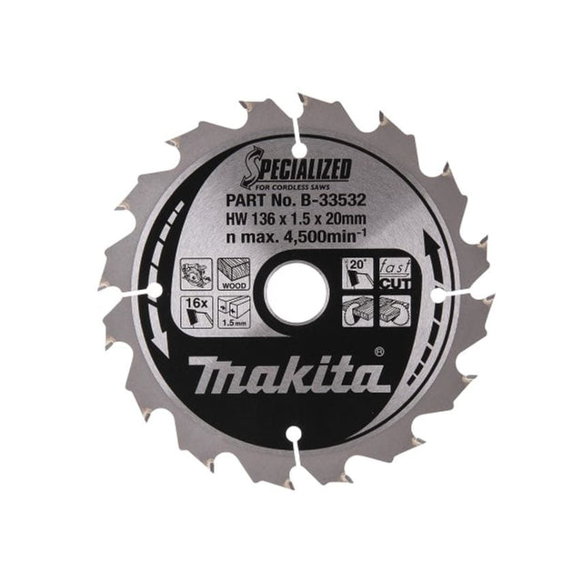 The Makita B-33532 Specialized Blade has been designed to extend battery life and run time when used with cordless saws. The precision honed tungsten teeth provide a fine cut in wood. Ultra-thin, perfectly tensioned steel plates enable a true run. Specifications: Blade Diameter: 136mm.Bore Size (Arbor Diameter) : 20mm.Kerf Dimension: 1.5mm.Tooth Quantity: 16.Rake Angle: 20.