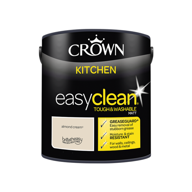 Crown Easyclean Kitchen Matt 2.5L Almond Cream Available in 16 on trend colours Tough and washable Matt finish (Ideal for high traffic areas) Greaseguard+ formulation, easy removal of stubborn grease Moisture and stain resistant Multi-surface. Great for Walls, Ceilings, Wood and metal Crowns unique Breatheasy formulation (Virtually odour free) Certified by the Asthma and Allergy Association 100% recycled packaging Mumsnet 98% of mumsnet users recommended Easyclean Matt