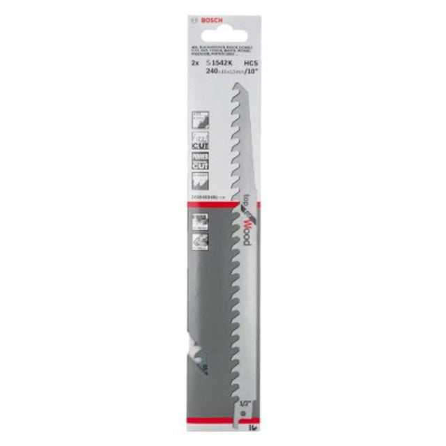 S 1542 K Top for Wood Reciprocating Saw Blade delivers powerful and fast cuts in wood Large tooth pitch (8.5 mm) and large gullets remove material quickly, enabling rapid cutting Sharp-ground, side-set teeth cut efficiently for powerful work, extra-thick gauge material provides ultimate stability Fits all S-shank reciprocating saws S 1542 K Top for Wood Reciprocating Saw Blade delivers powerful and fast cuts in wood Sharp-ground, side-set teeth cut efficiently for powerful work, extra-thick gauge material provides ultimate stability HCS blade material for cutting wood and non-abrasive woodworking materials in construction applications Long blade length of 240 mm enables a cutting capacity of up to 190 mm